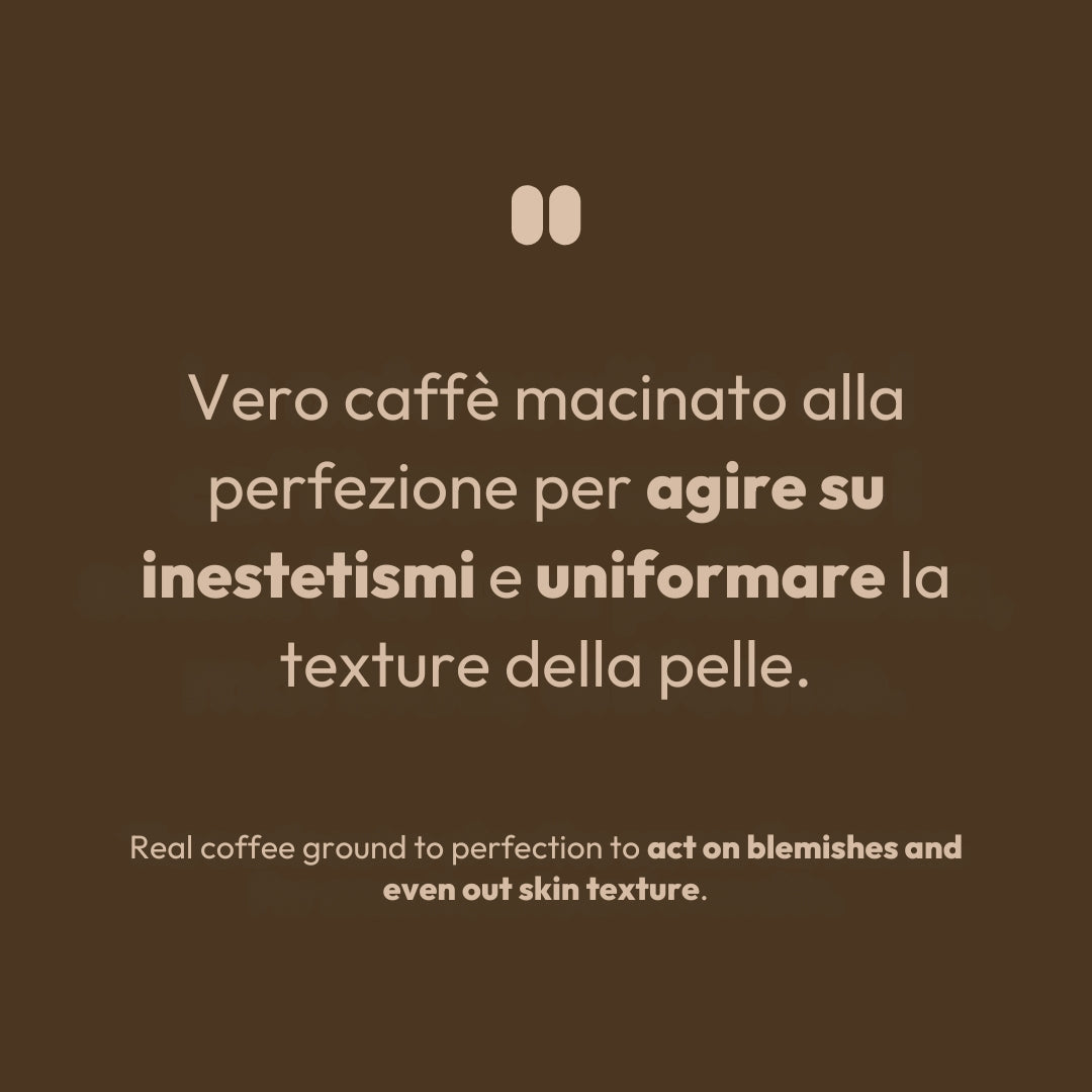 Sono lo scrub corpo con note esotiche di caffè, perfettamente macinato per levigare il tuo corpo, insieme a pregiato burro estratto dalle fave di cacao per nutrire ed idratare la pelle. E ancora non hai visto il risultato: sono efficace su cellulite, smagliature, cicatrici, brufoli sotto pelle, acne e pelle non uniforme. Quando mi aprirai, ti verrà voglia di mangiarmi. E succederà a tutte le parti del tuo corpo in cui mi userai!